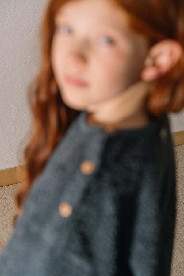 首元には木製ボタン付きで、かぶりやすいデザイン。