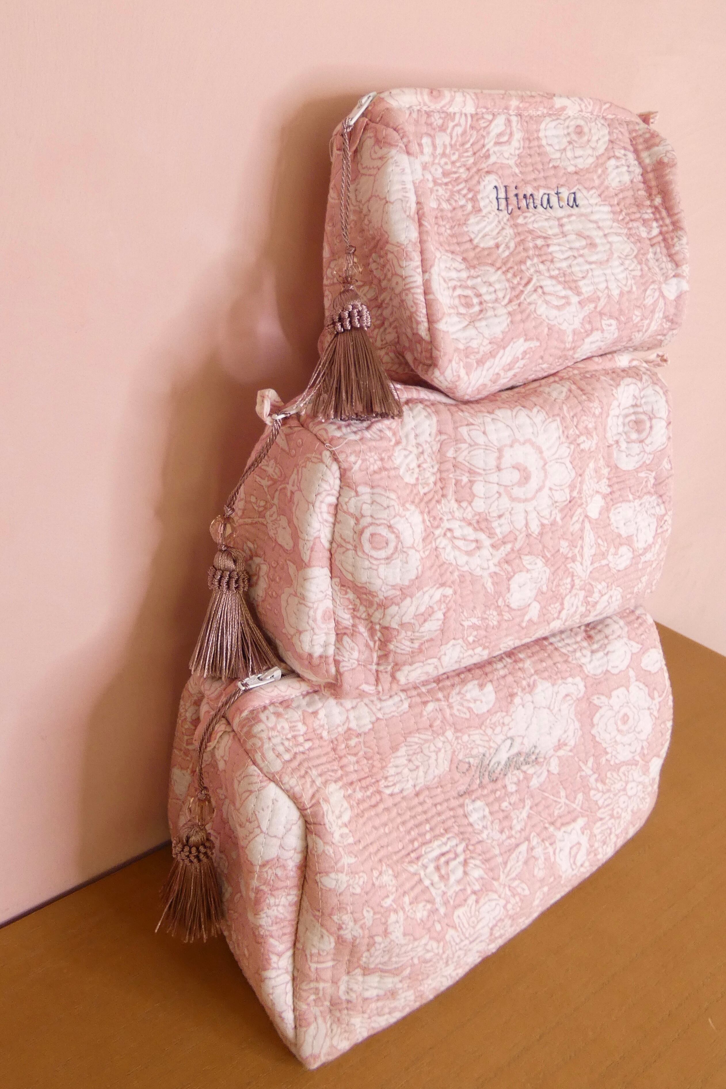 【名入れ刺繍可】Mサイズブロックプリントポーチ/ライトピンク