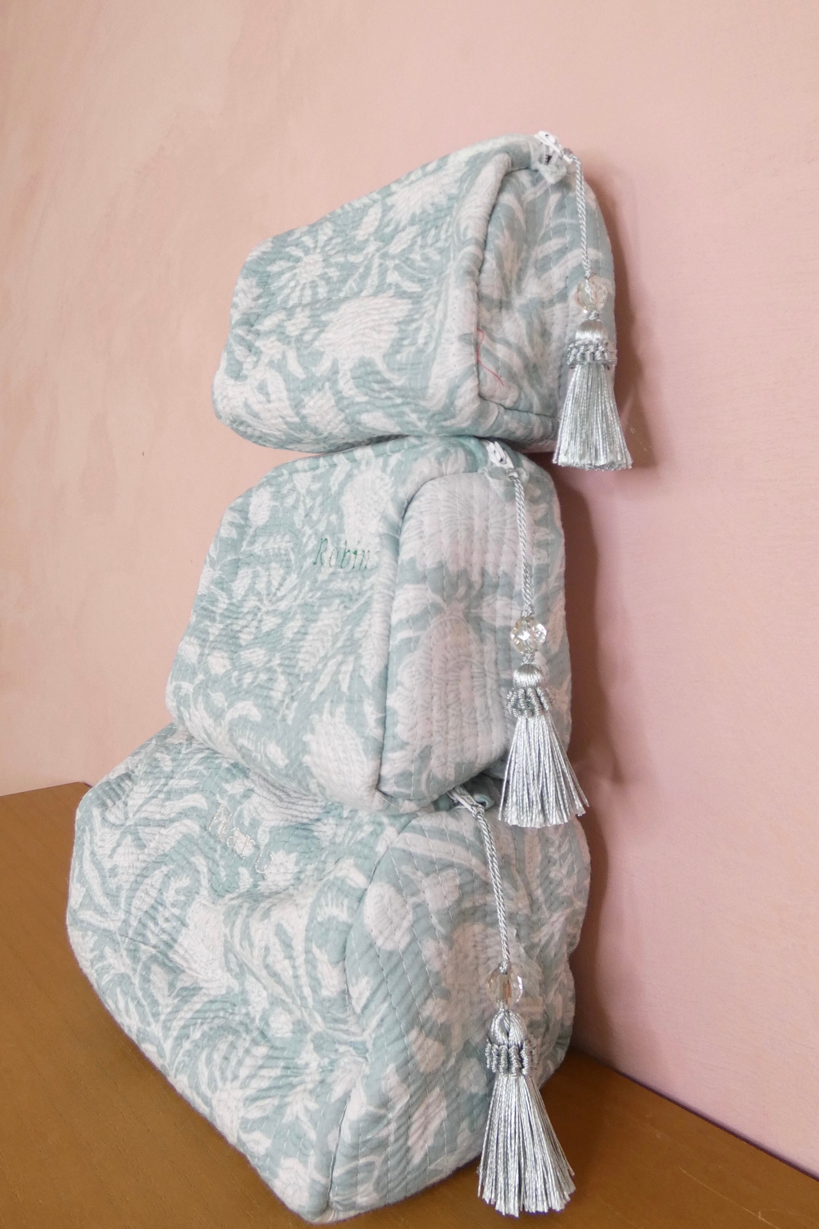 【名入れ刺繍可】Mサイズブロックプリントポーチ/ミント