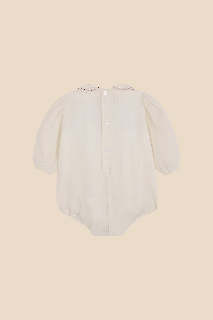 襟元の刺繍デザインが魅力の軽やかなロンパースです。